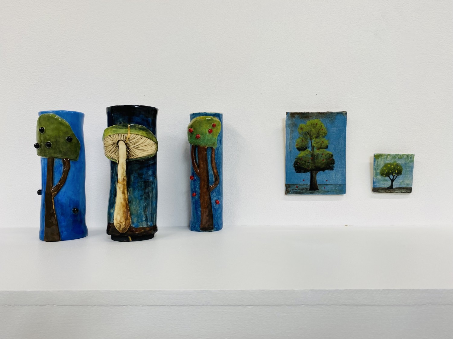Tall teal-green juglet 2022, Brick red juglet with blue handle 2020, Midnight blue juglet with red handle 2022