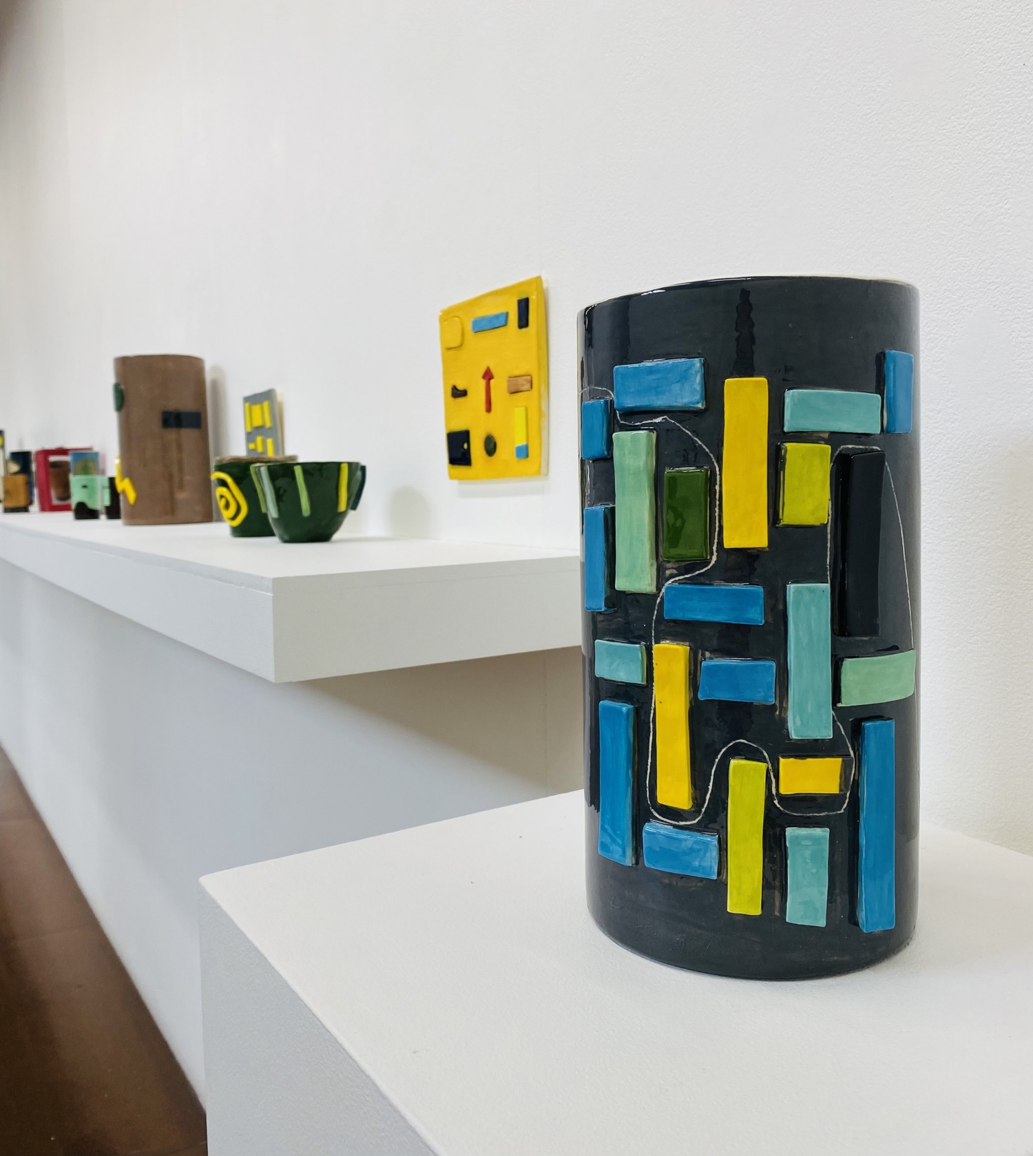Black vase with coloured shapes