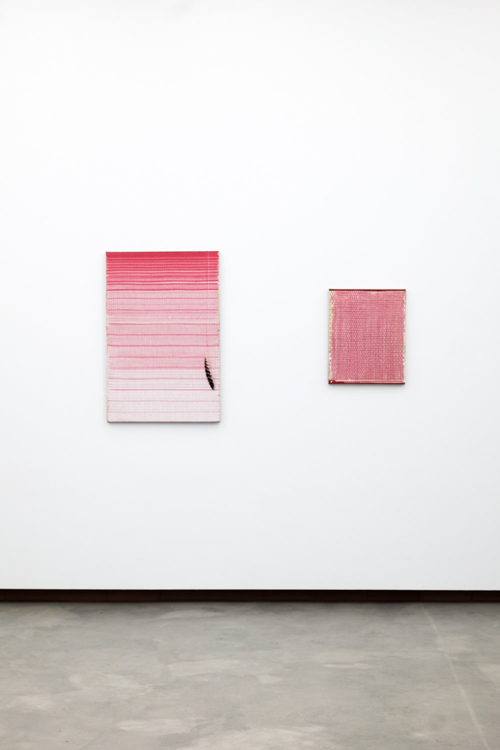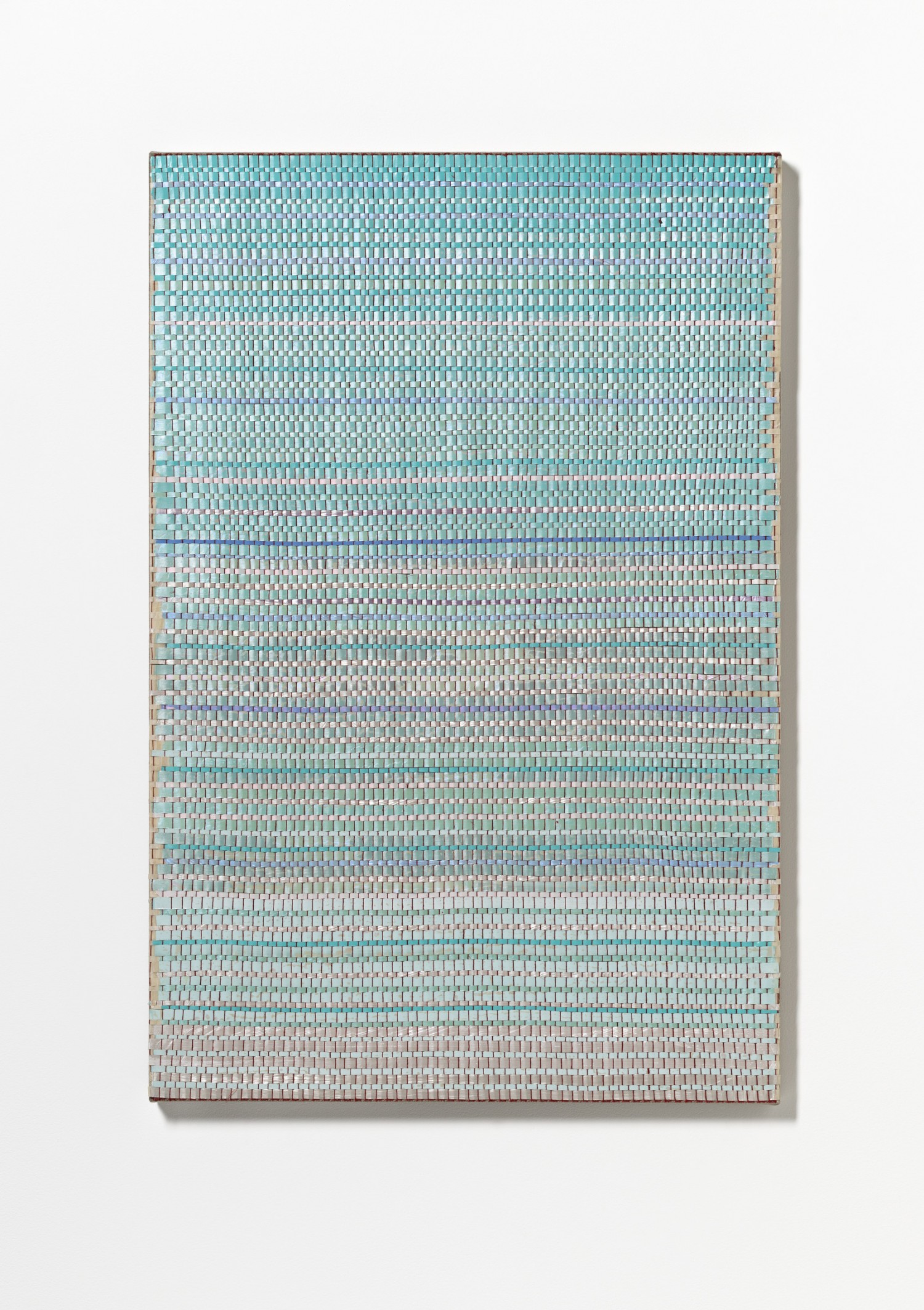 synthetic polymer emulsion, iridescent pigment, micaceous iron oxide, Japanese kozo natural paper, linen and cotton thread on wooden panel